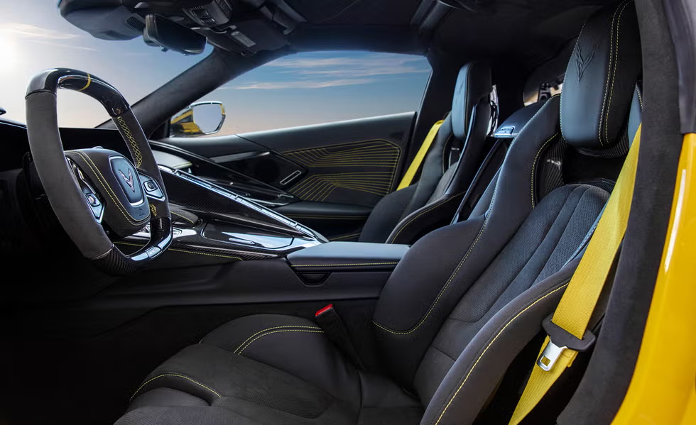Though it’s built on the C8 Corvette chassis, the 2025 ZR1 is crafted with many new and unique components, from its twin-turbo V-8 engine to its advanced aerodynamics. Carbon-ceramic brake rotors—15.7 inches in front, the largest ever fitted to a Corvette—are the product of a new process claimed to reduce operating temps and increase durability. Five new wheel designs—four alloys and one carbon-fiber option—are available, and an available carbon-fiber roof reduces weight. Fresh colors, including Competition Yellow, Hysteria Purple, and Sebring Orange (the last a reissue of the popular C7 Corvette ZR1 hue), make the ZR1’s list of available features, as do various full-length body stripes and choice of caliper and seatbelt colors.
